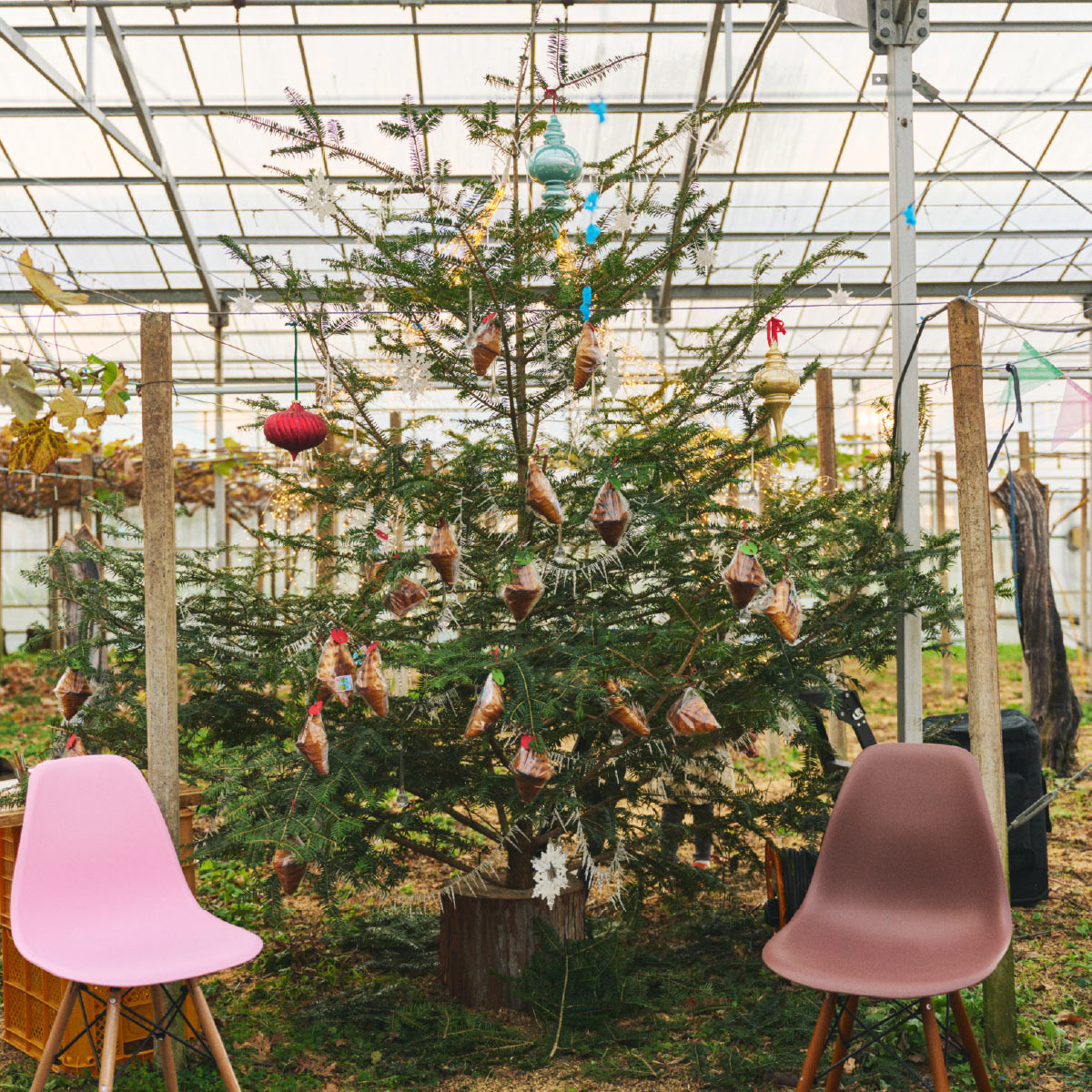ぶどうの葉が落ちた冬のぶどう園に、オクシズのきこり〈山川草木〉さんが切り出したモミの木が立ち、畑はクリスマスの舞台に変わりました。ぶどう狩りの代わりに行われたのは、世界初かもしれない “クロワッサン狩り”。聞き足りなかった音楽のアンコールとともに、少し早いクリスマスを畑で祝います。