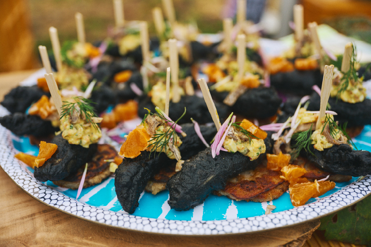 鯛の竹炭フリット、蜜柑と菊の香りのピンチョス。家康が愛した「鯛の天ぷら」を、静岡の柑橘と花の香りで現代的に再構築した一品。