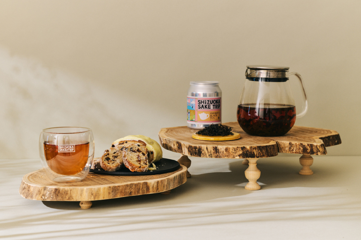 SAKE TRIPオリジナルのウッドプレート。天然木を丁寧に磨き、脚を付けて、少しおしゃれなプレートに仕立てました。その上に皿とメニューを添え、森の温もりとともにお客様をお迎えします。